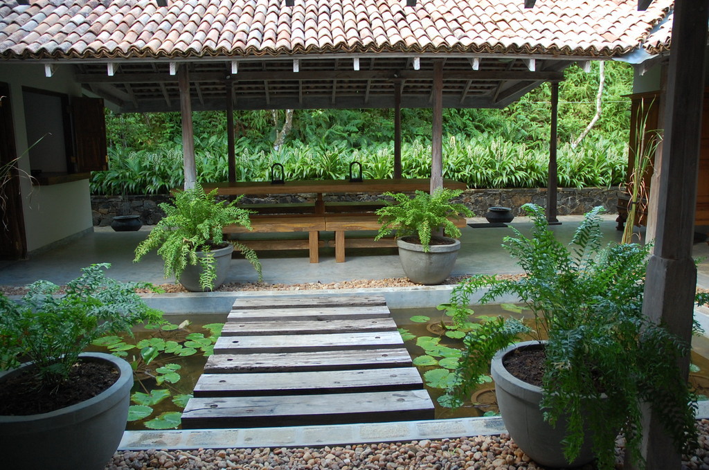Nestling at the edge of a 5 acre tea and cinnamon plantation and surrounded by tropical gardens, you can't help but soak up the atmosphere, sitting out on the shady verandah, dining in the courtyard with its ornamental pool, browsing the extensive Sri Lankan book collection in the Tea House library or lounging by the large swimming pool or in the Ambalama.